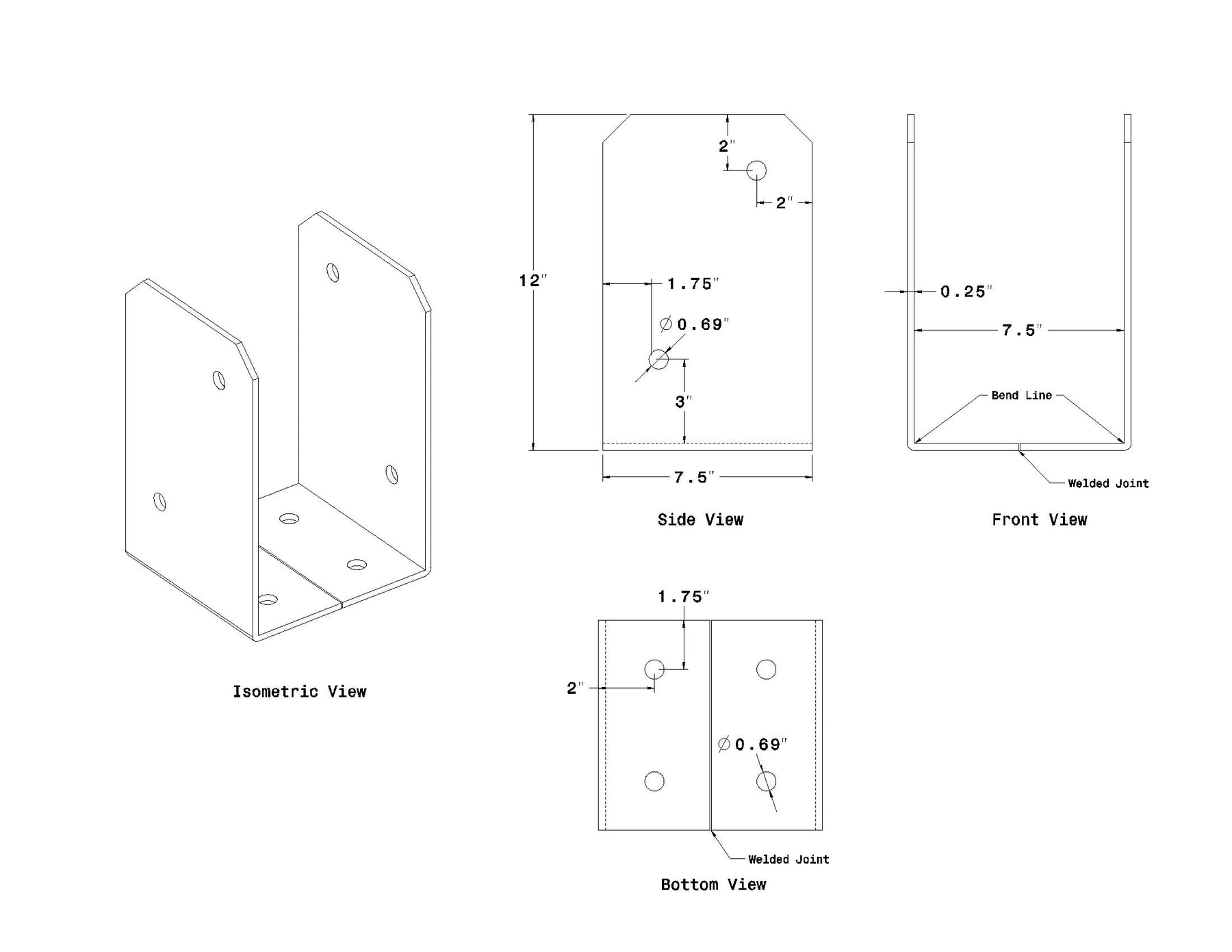 Post Base - 7.5 inch x 7.5 inch x 12 inch tall. Made from 1/4 inch thick steel plate