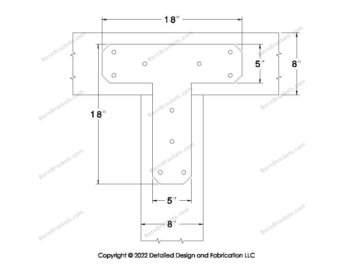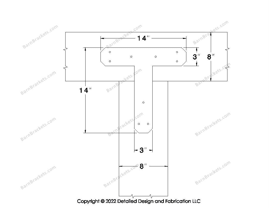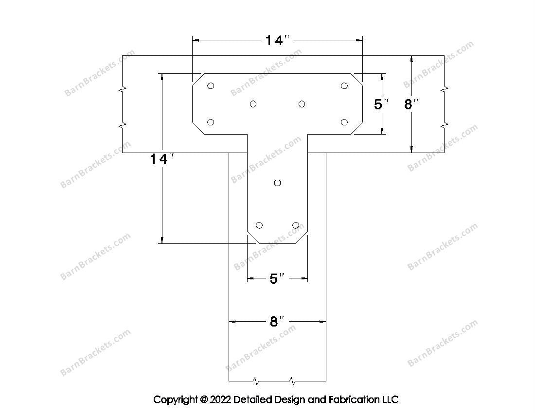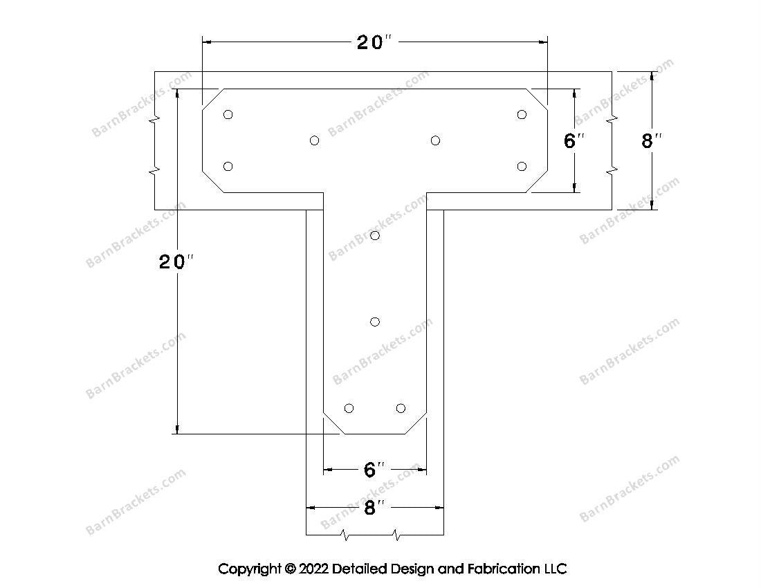 T shaped Brackets for 8 inch beams - Chamfered - Triangular style holes - BarnBrackets.com