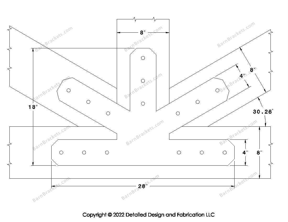 Fan Brackets for 8 inch beams - 4 inch Large centered joint - Chamfered - Centered style holes - BarnBrackets.com