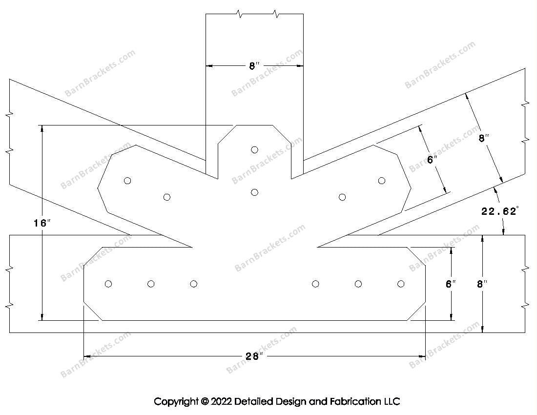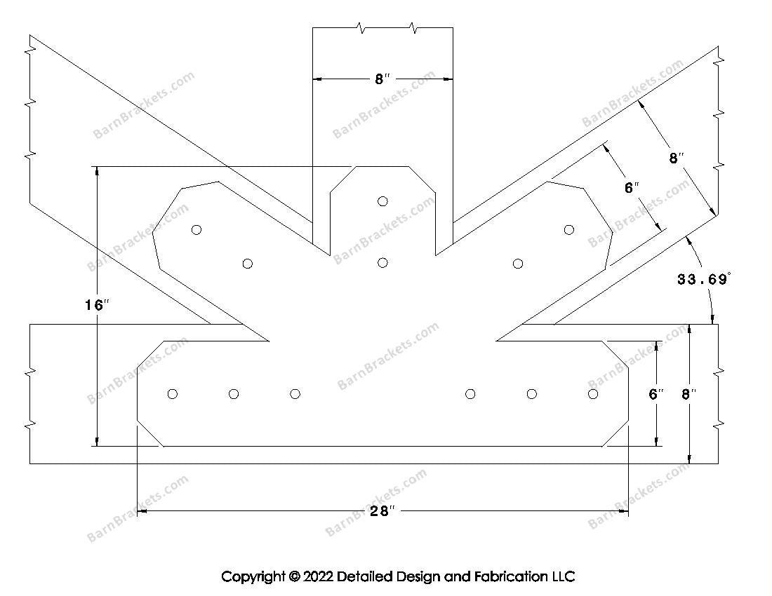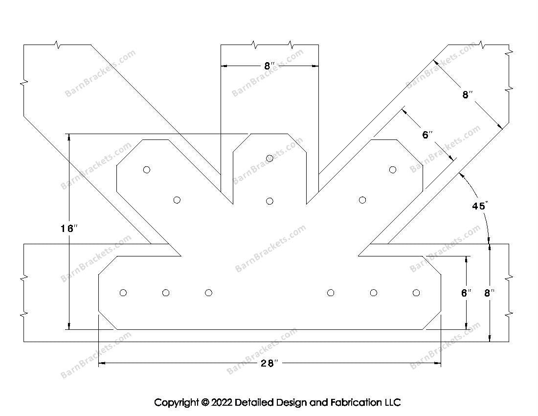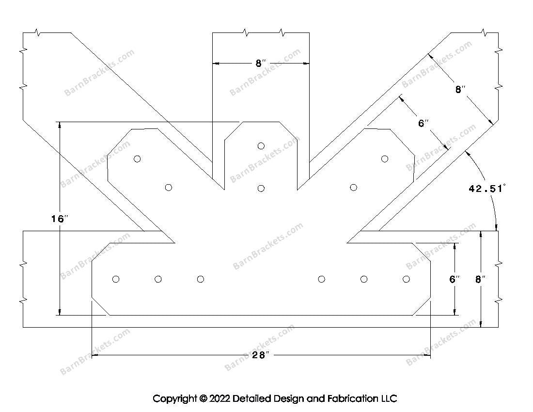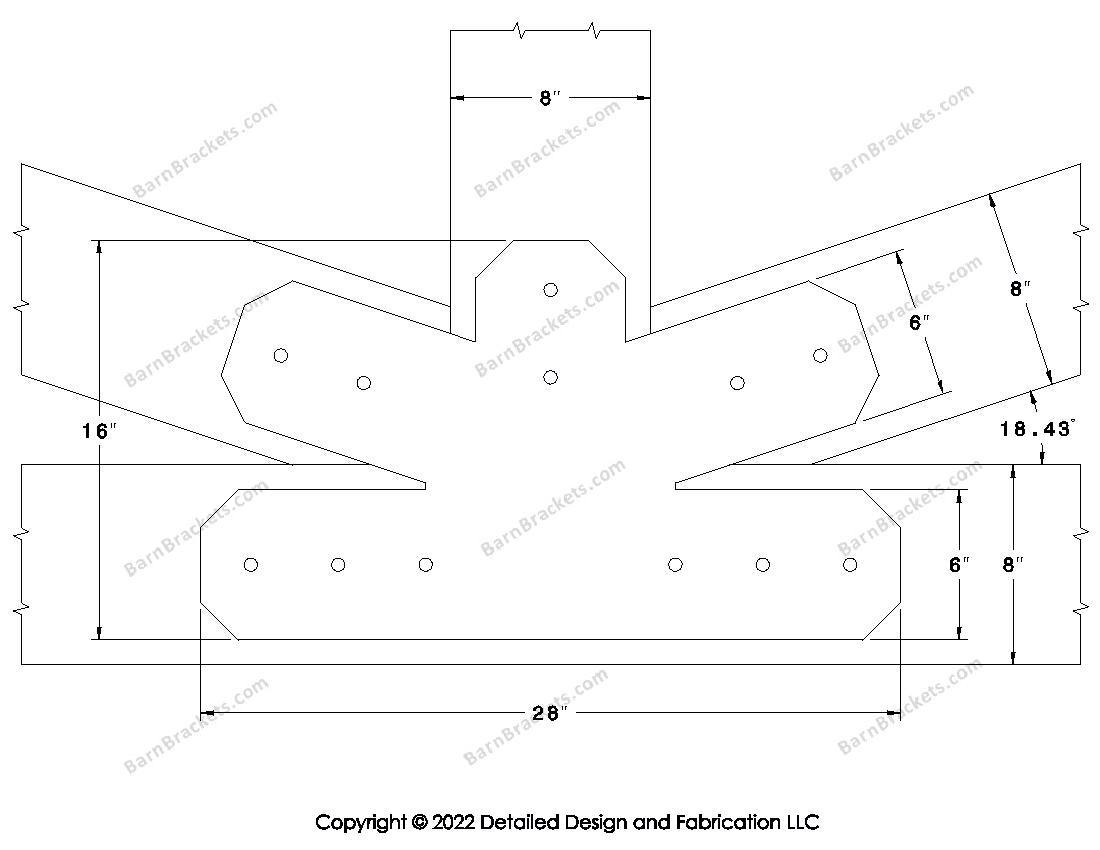 Fan Brackets for 8 inch beams - 6 inch Regular centered joint - Chamfered - Centered style holes - BarnBrackets.com
