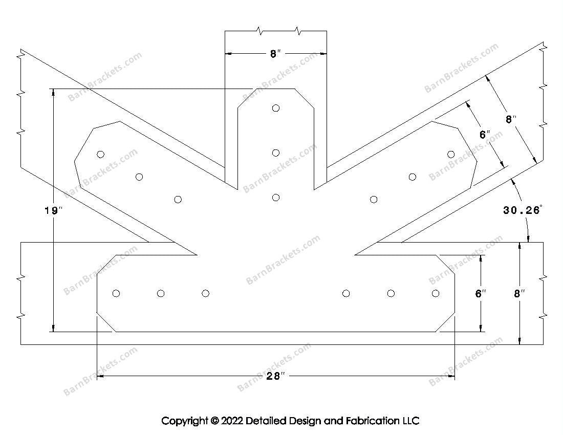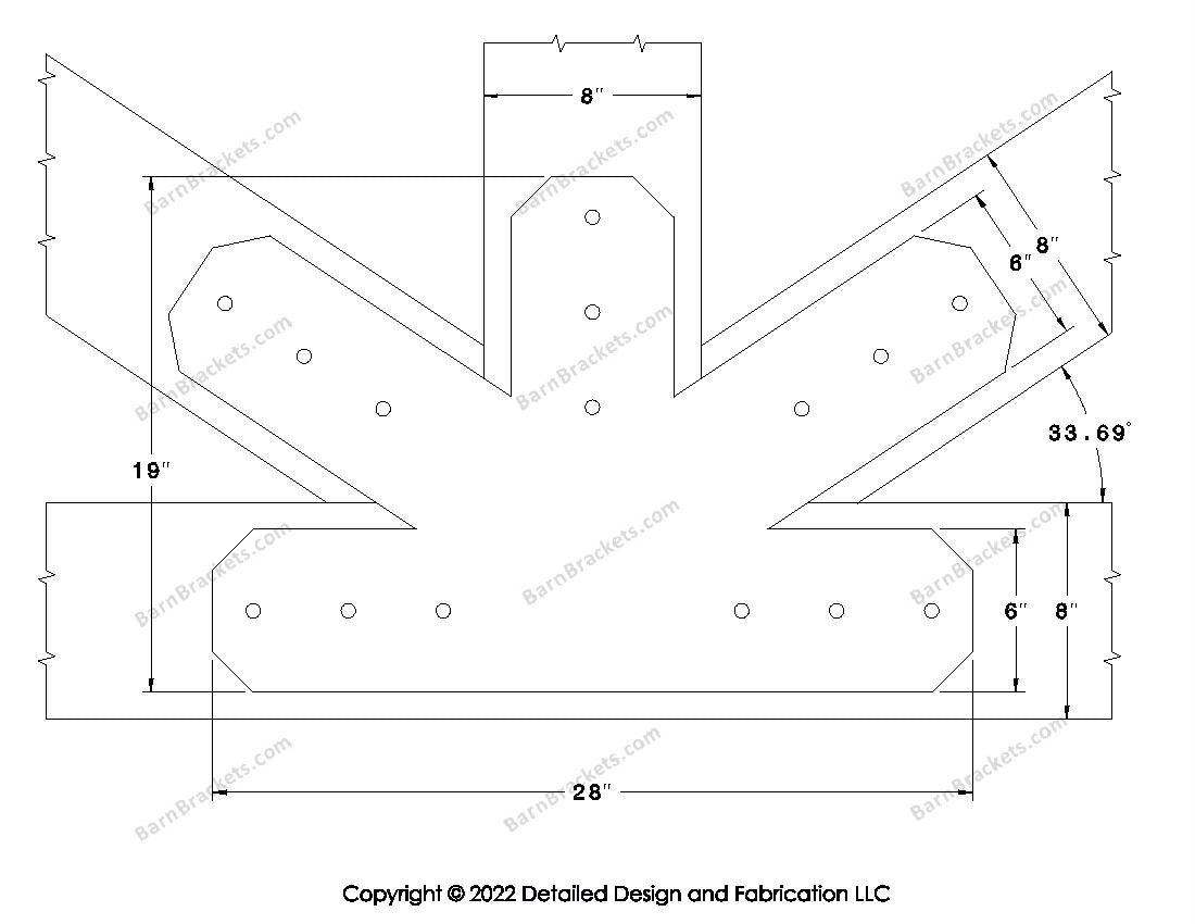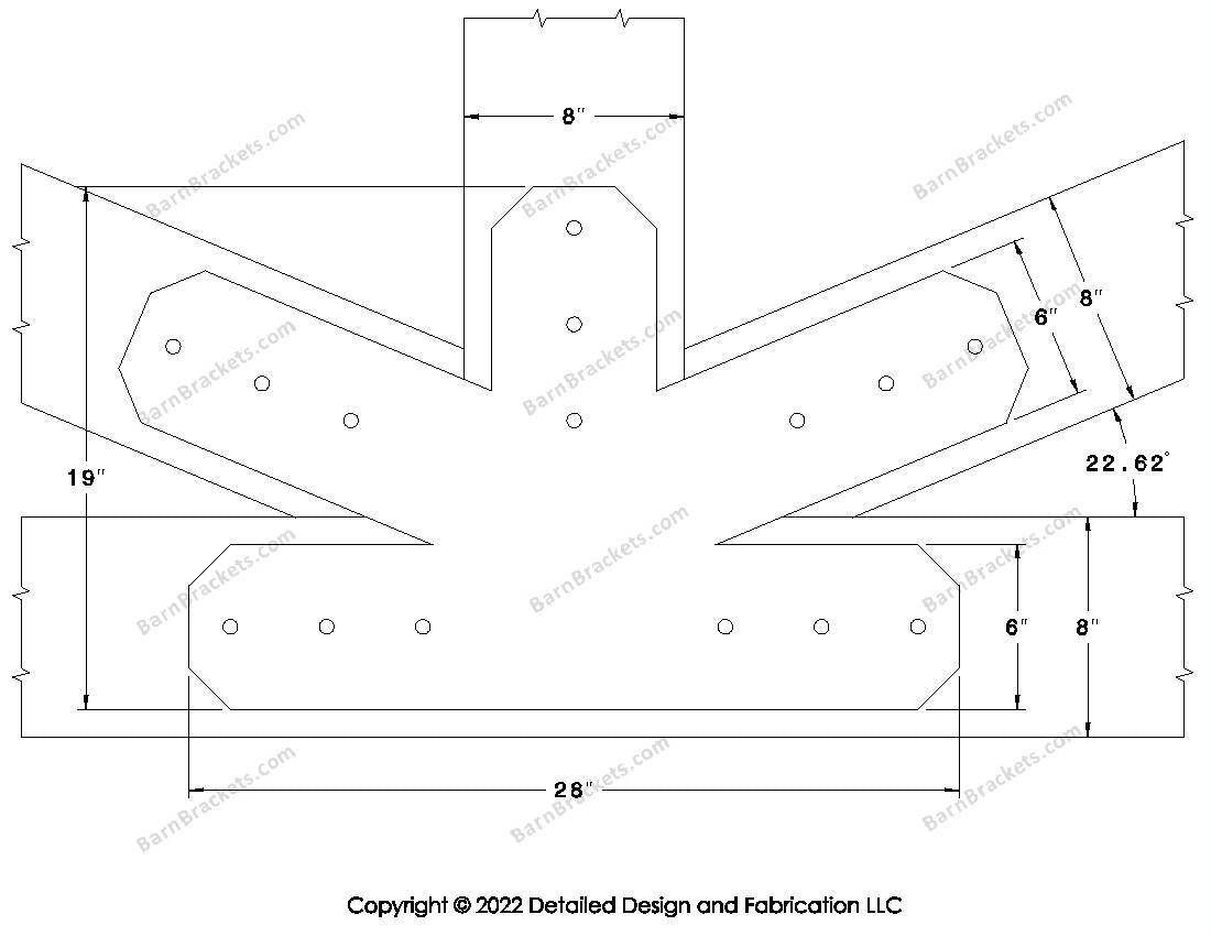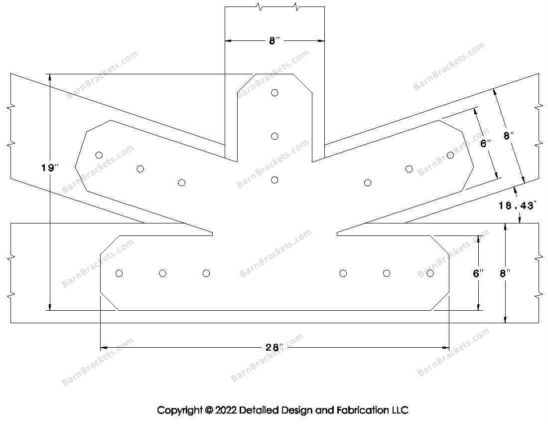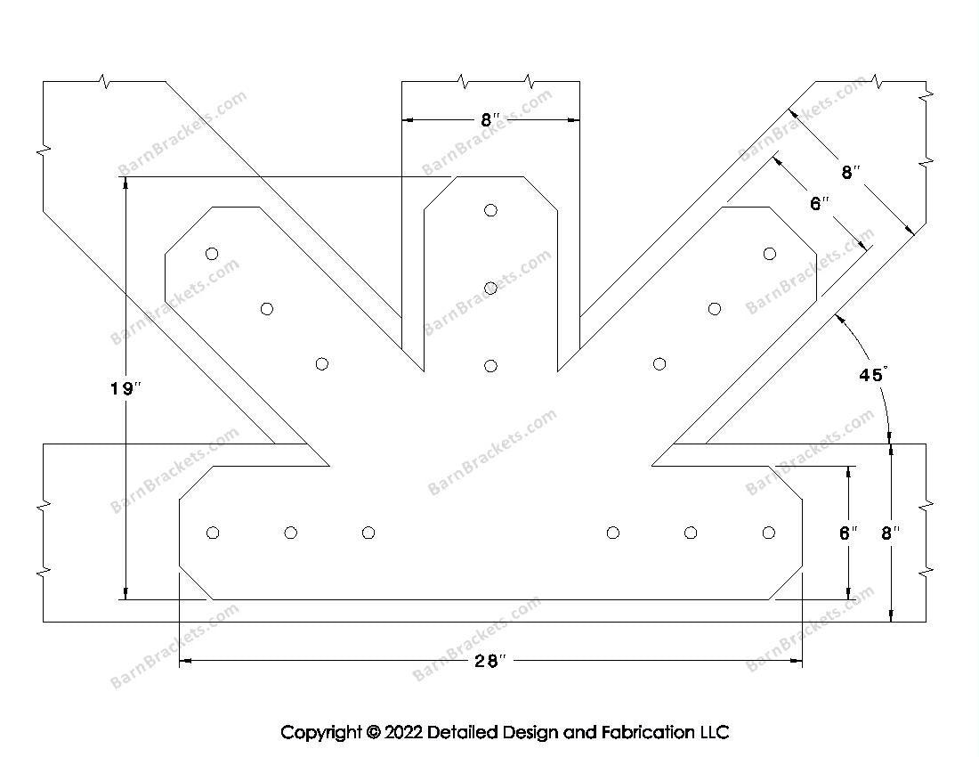 Fan Brackets for 8 inch beams - 6 inch Large centered joint - Chamfered - Centered style holes - BarnBrackets.com