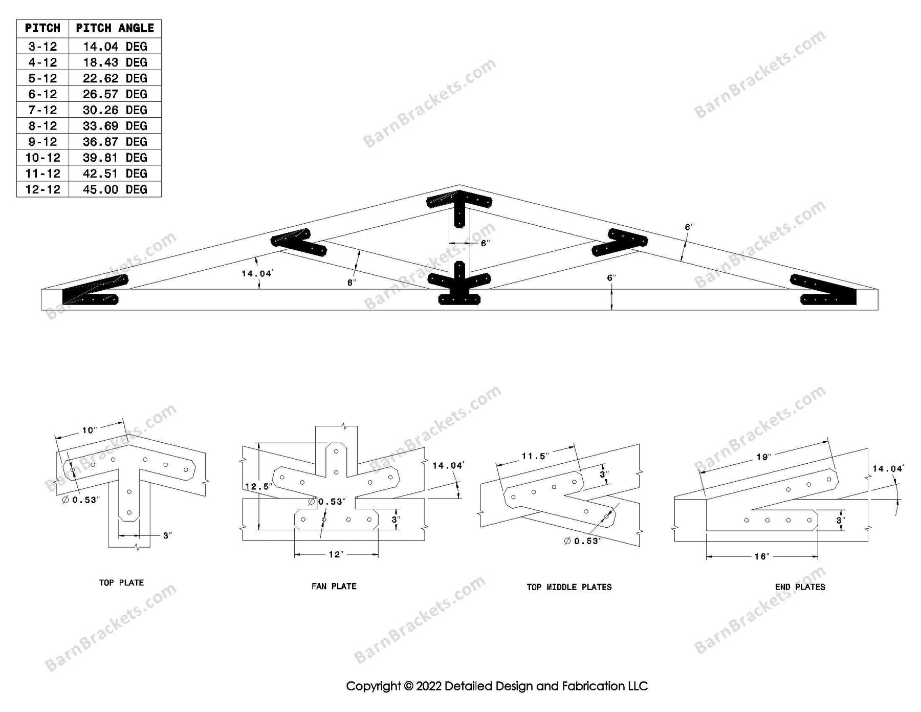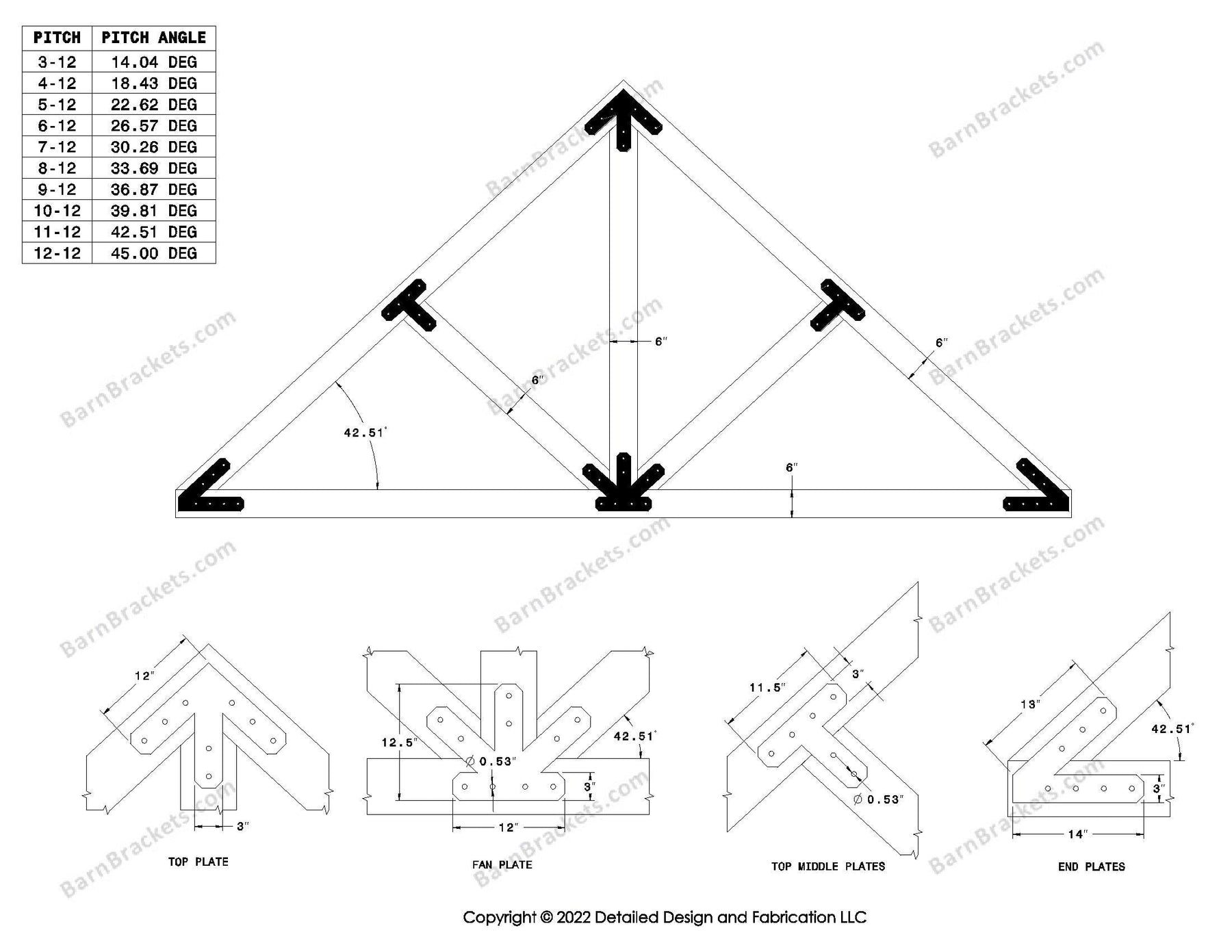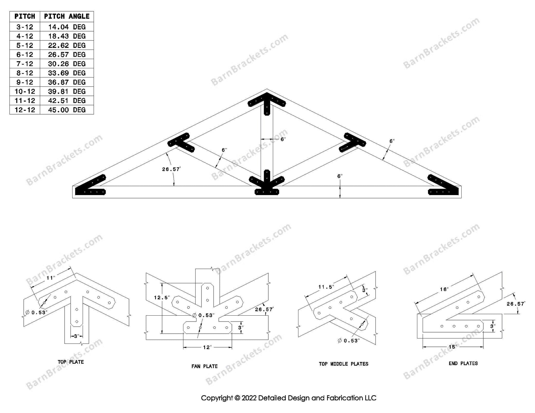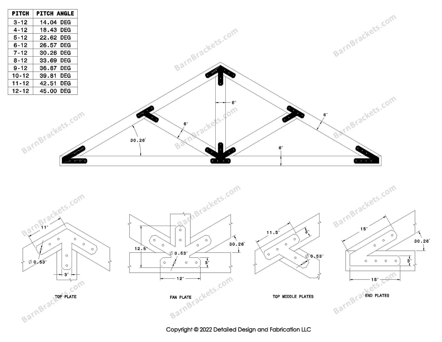 Steel timber truss bracket set for a 6/12 pitch roof.