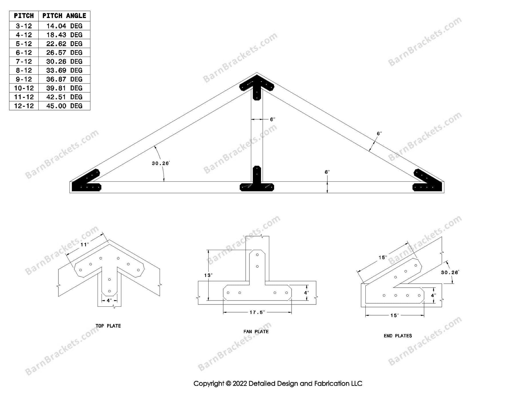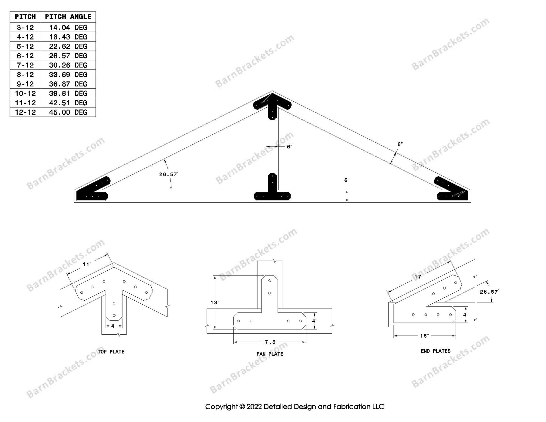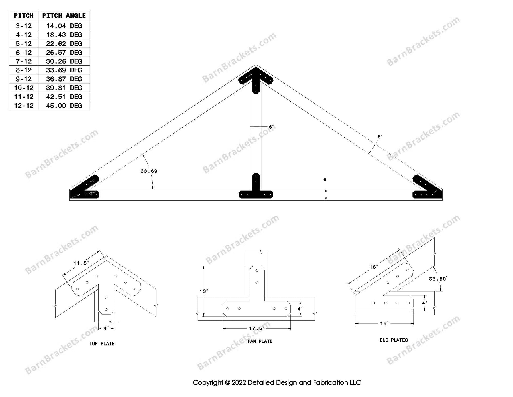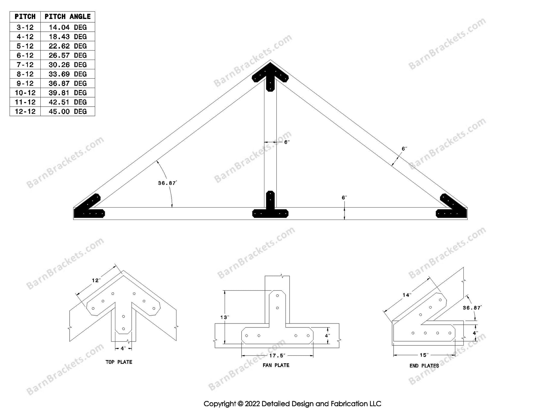 4 inch timber truss plate set for 6 inch wood beams 8-12 pitch.  King post only truss with flush ends and chamfered corners.