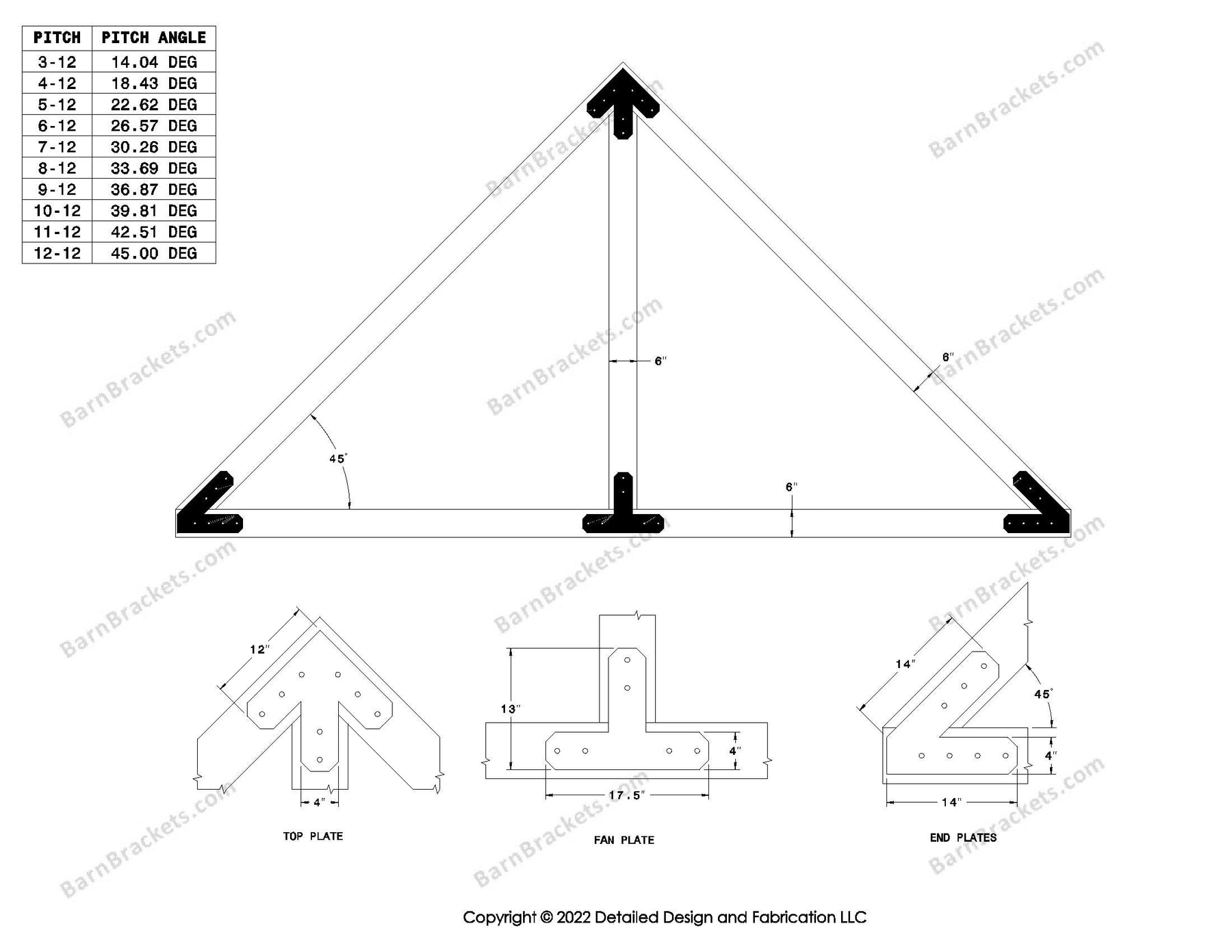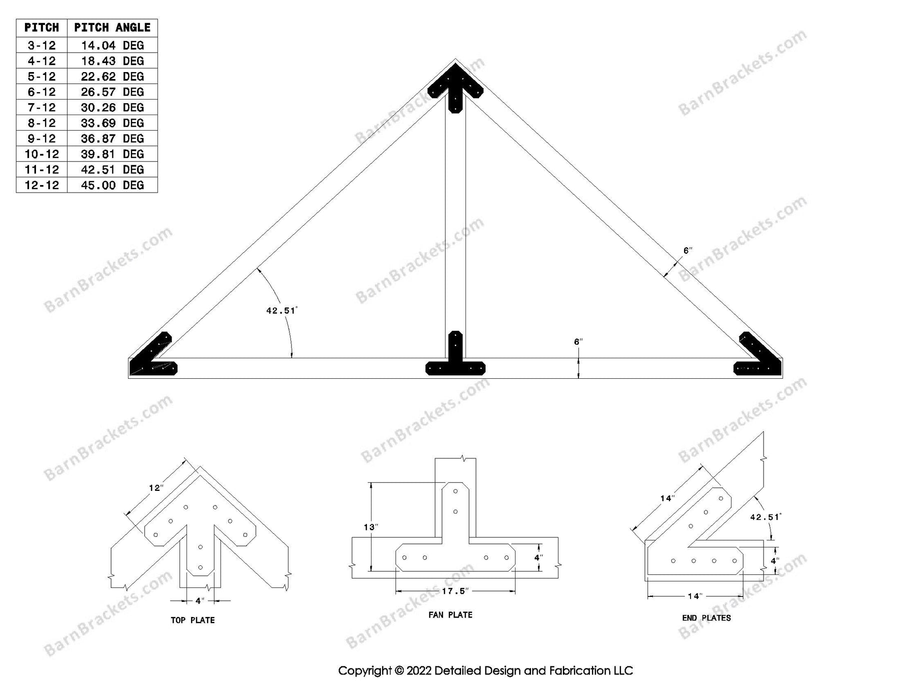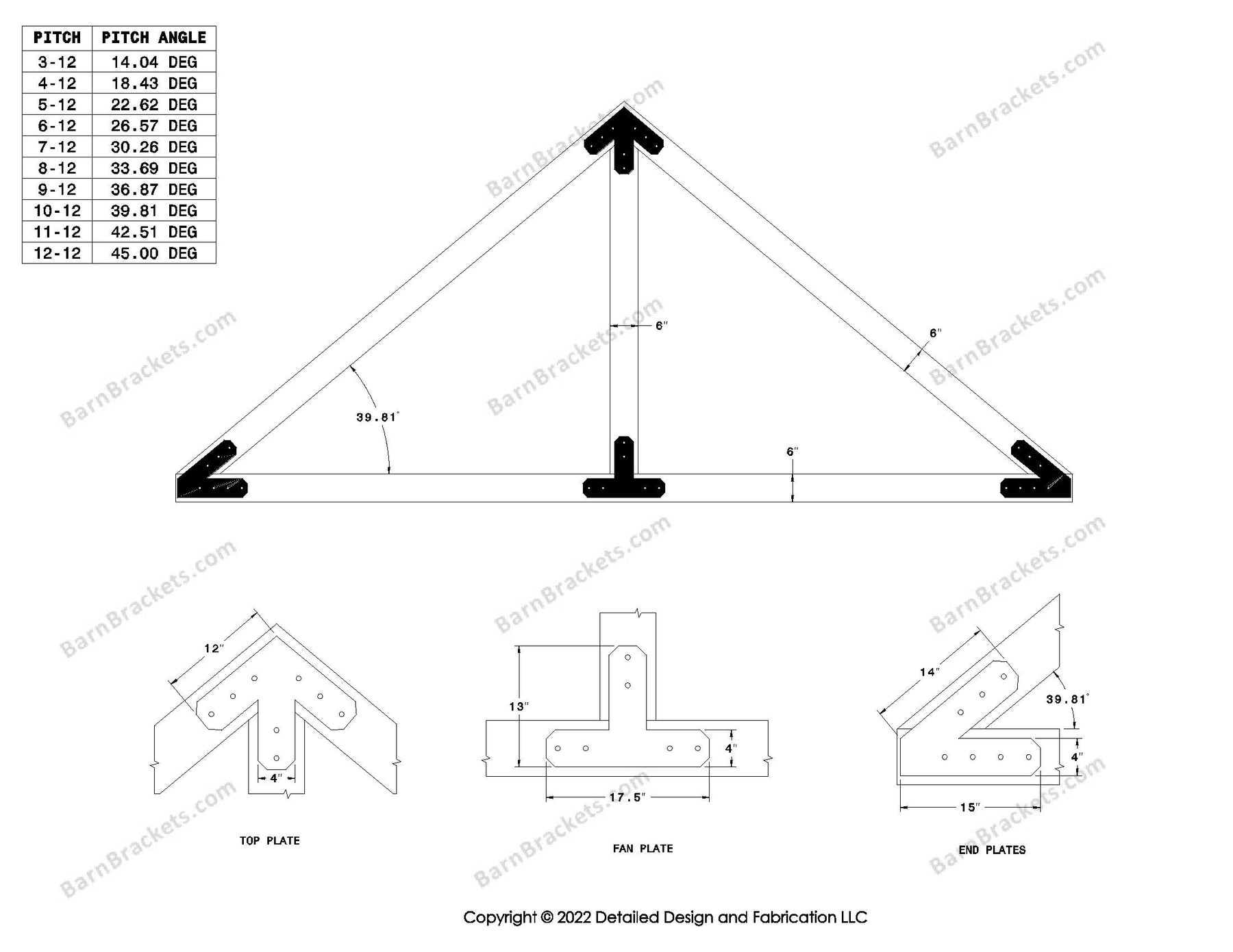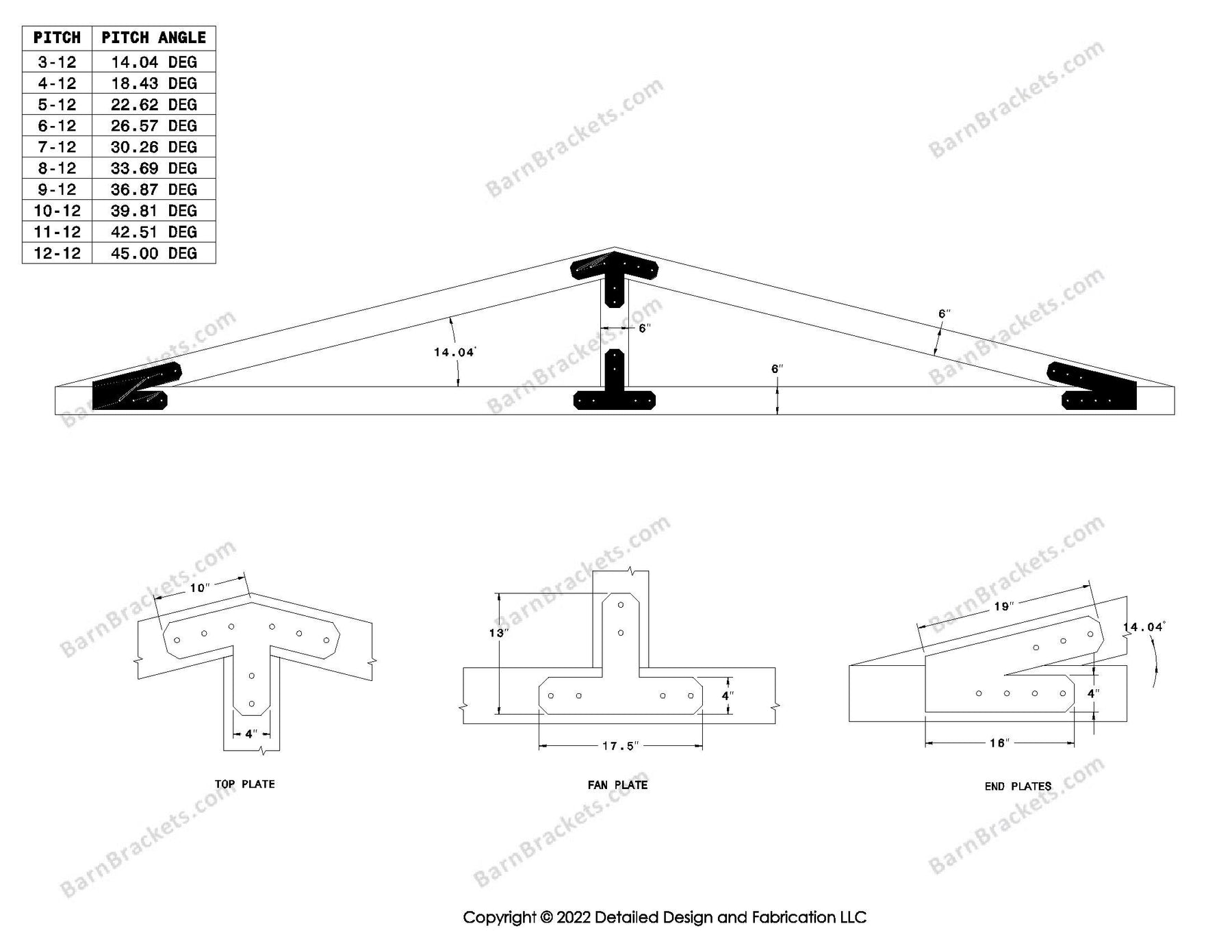 4 inch timber truss plate set for 6 inch wood beams 8-12 pitch.  King post only truss with flush ends and chamfered corners.