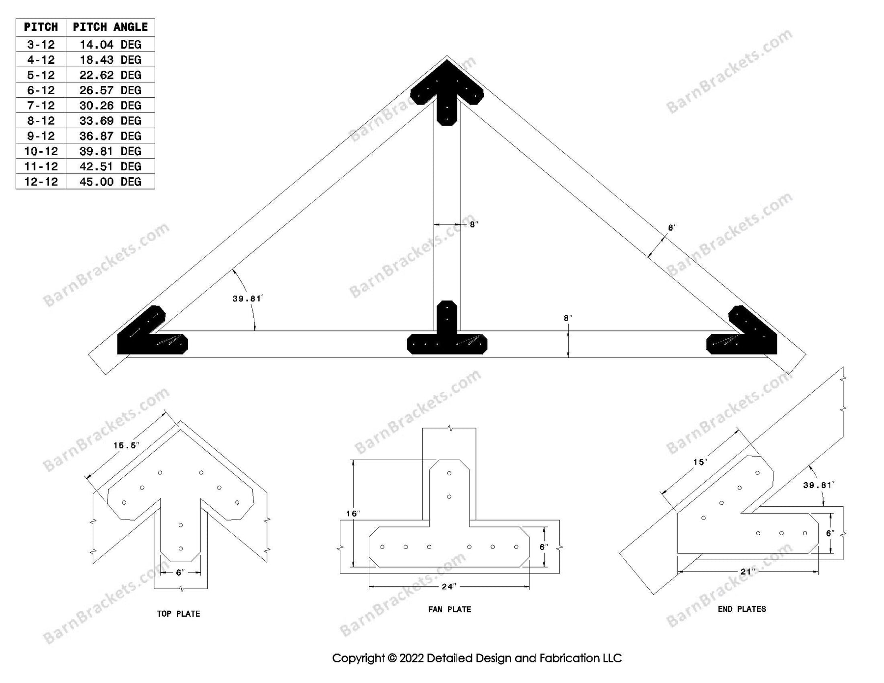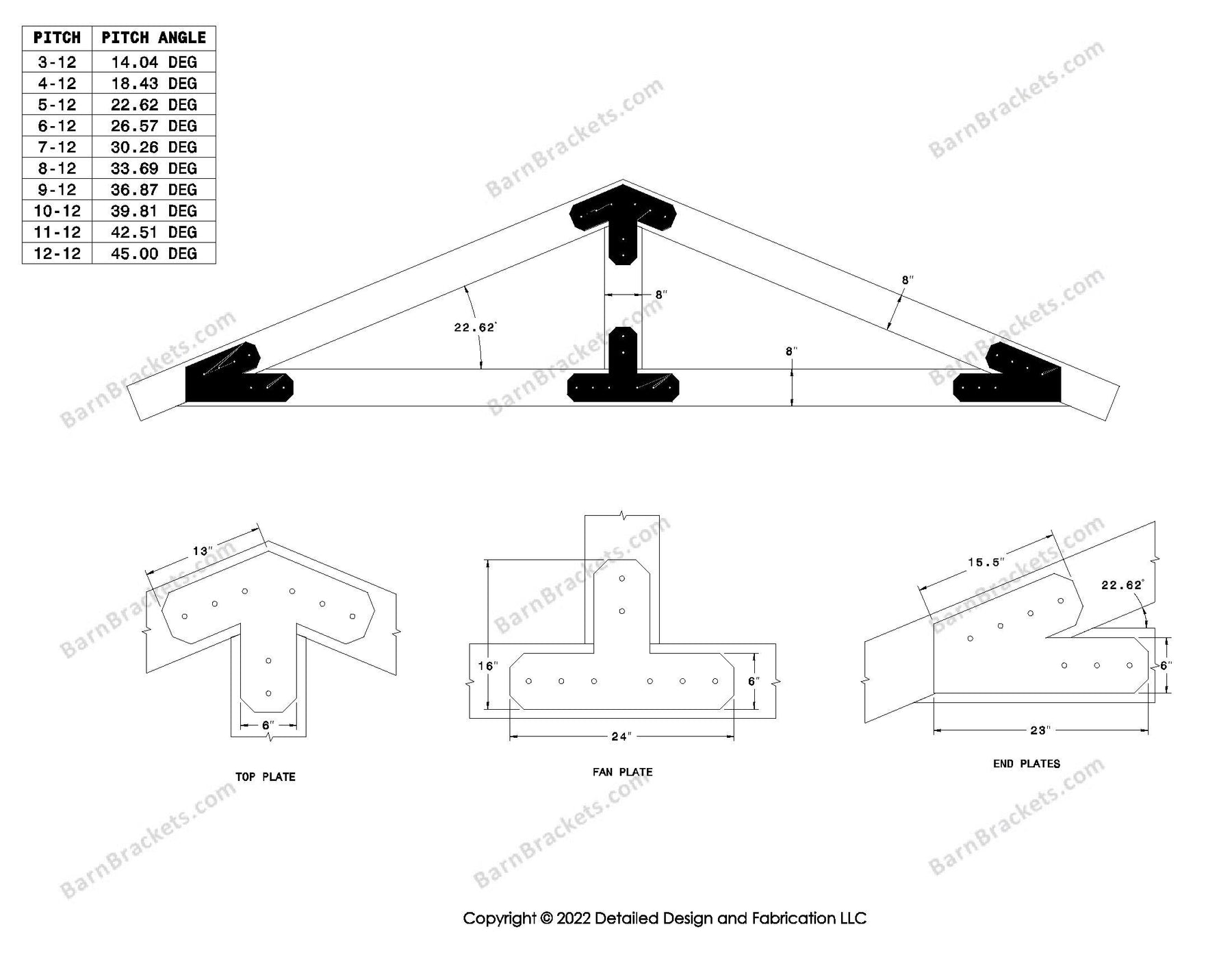6 inch steel bracket kits for a post and beam truss.  These brackets are for 8 inch timber beams.  King post only truss.  Designed with overhang ends and chamfered corners.  Dimensions are for a 12-12 pitch roof.