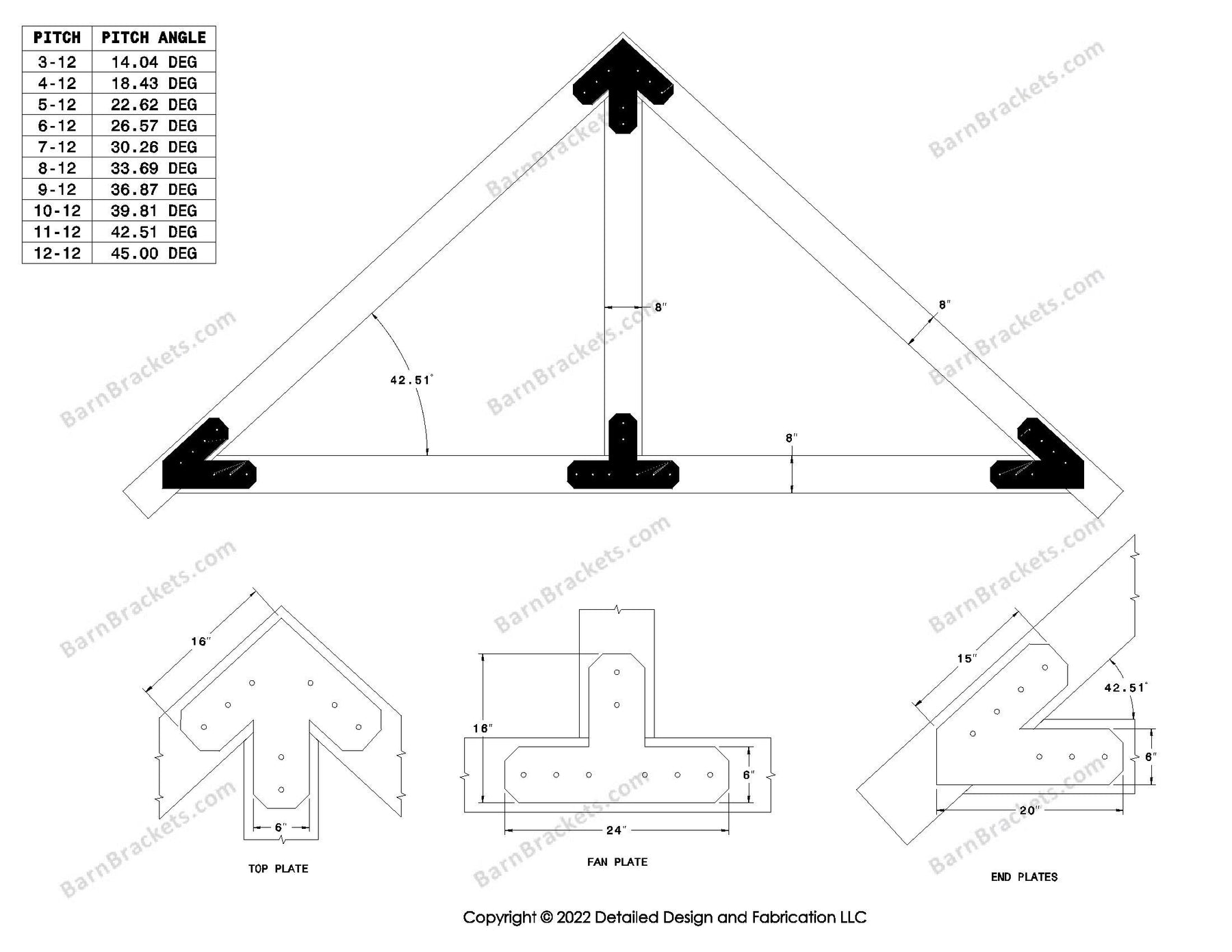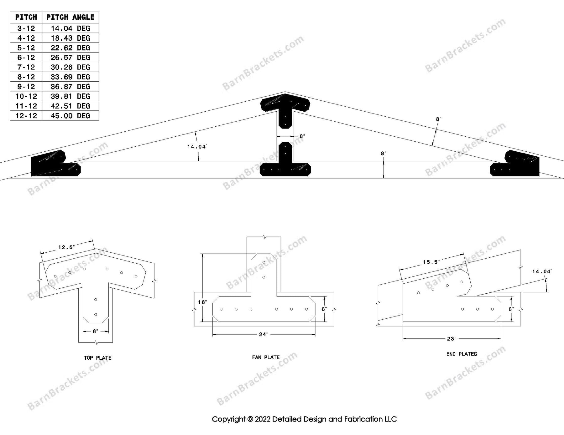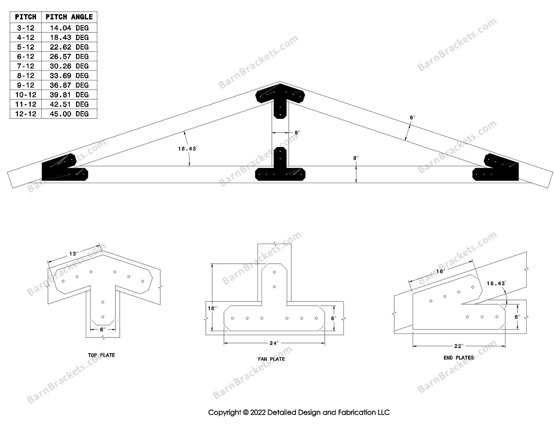 6 inch steel bracket kits for a post and beam truss.  These brackets are for 8 inch timber beams.  King post only truss.  Designed with overhang ends and chamfered corners.  Dimensions are for a 3-12 pitch roof.