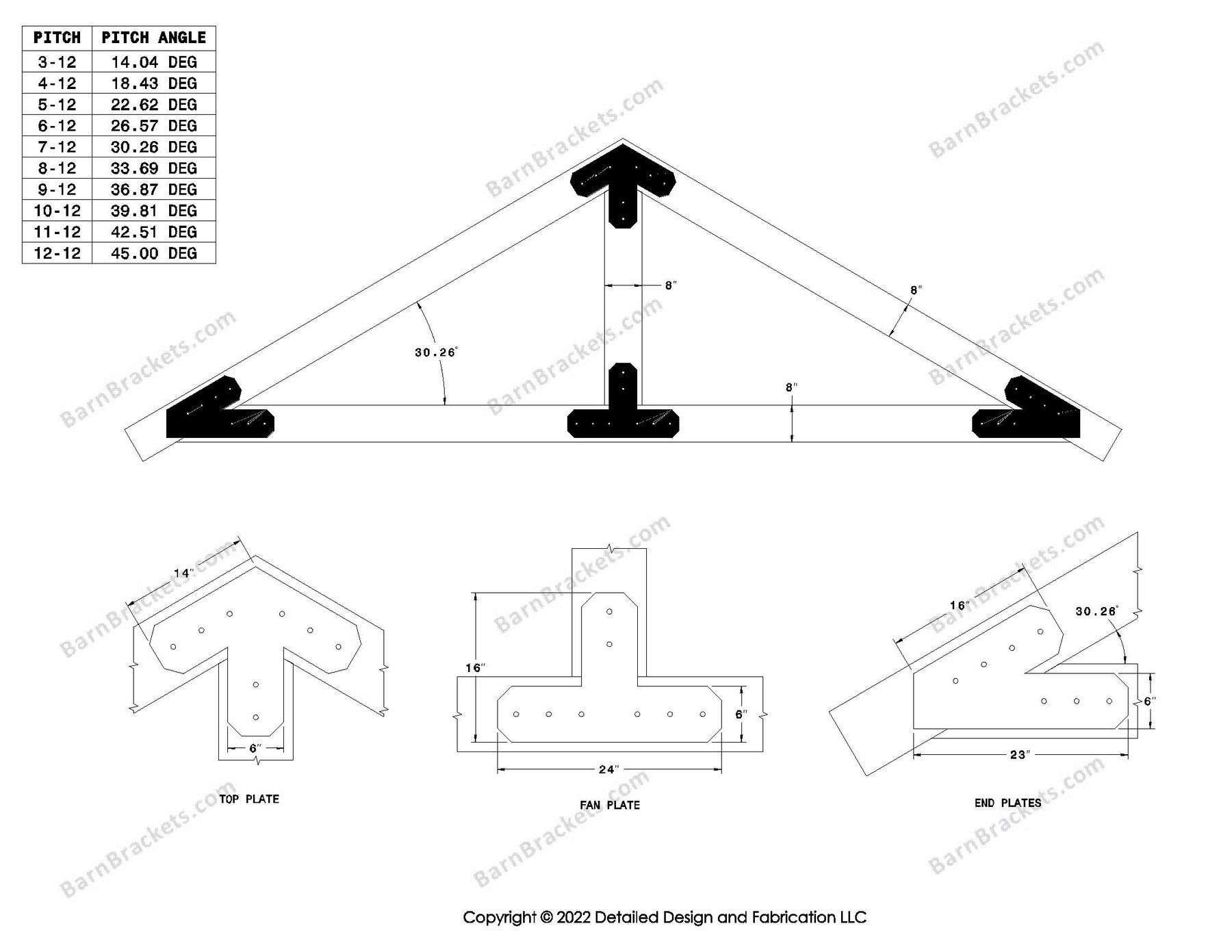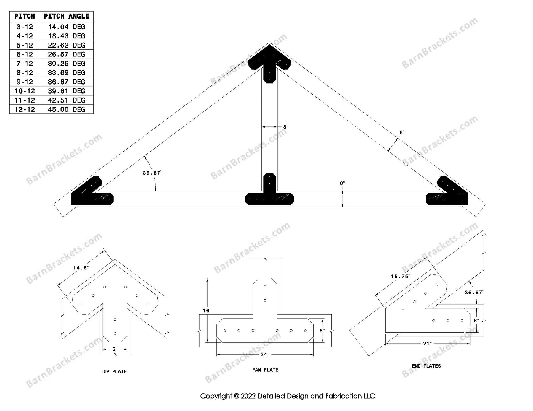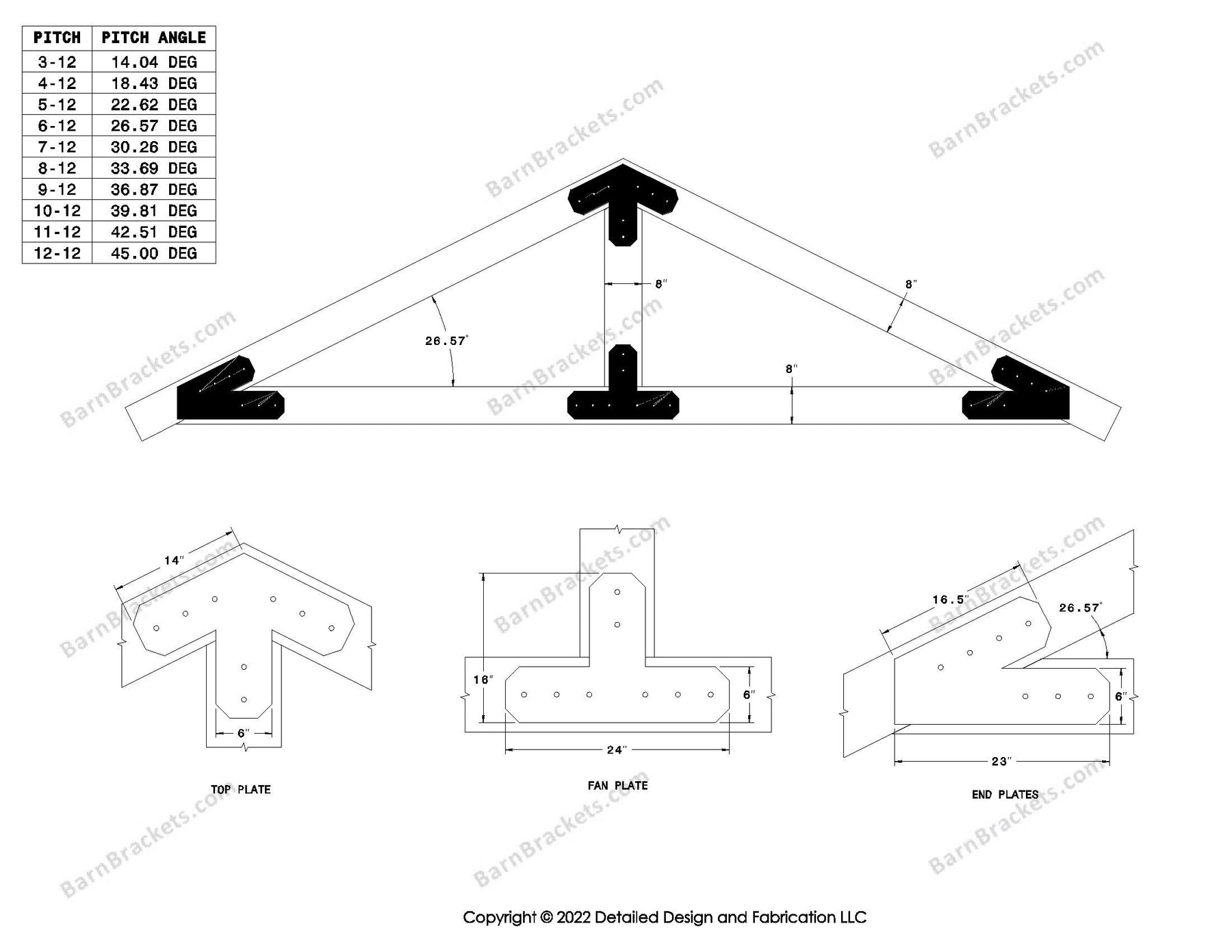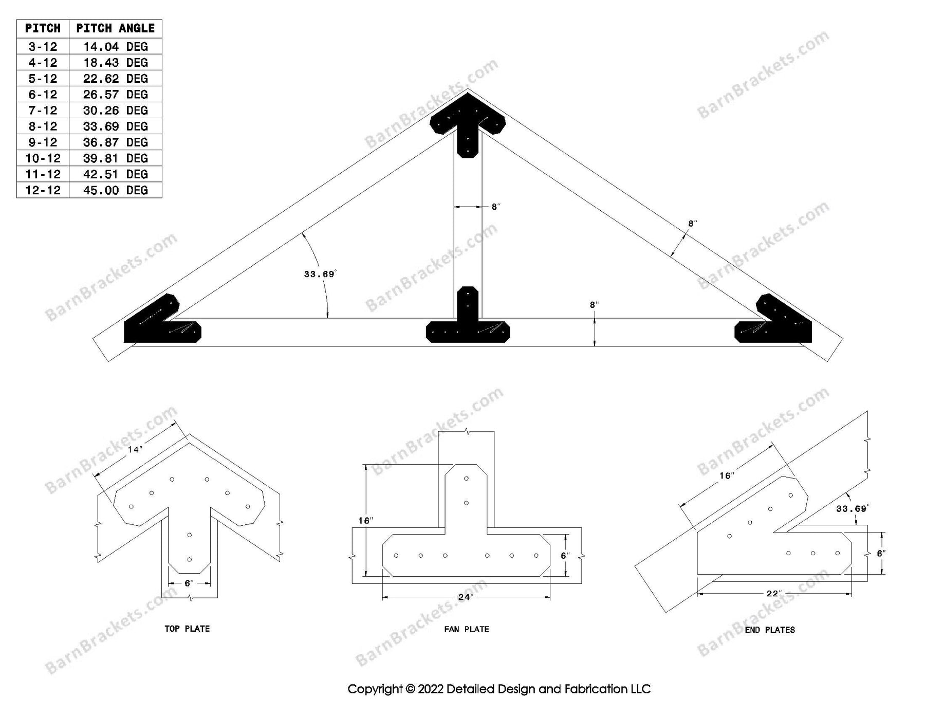 6 inch steel bracket kits for a post and beam truss.  These brackets are for 8 inch timber beams.  King post only truss.  Designed with overhang ends and chamfered corners.  Dimensions are for a 3-12 pitch roof.