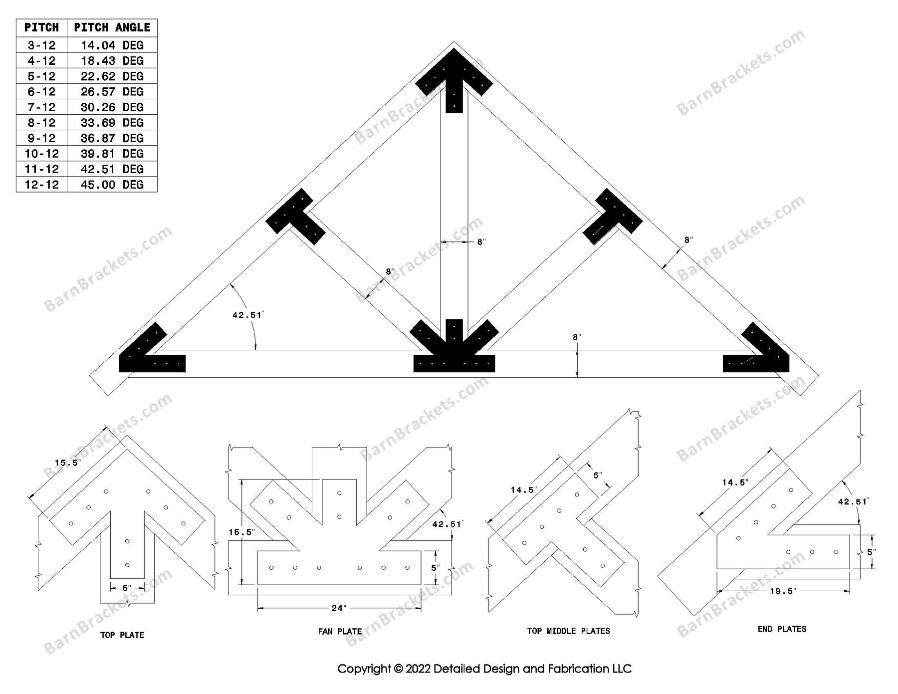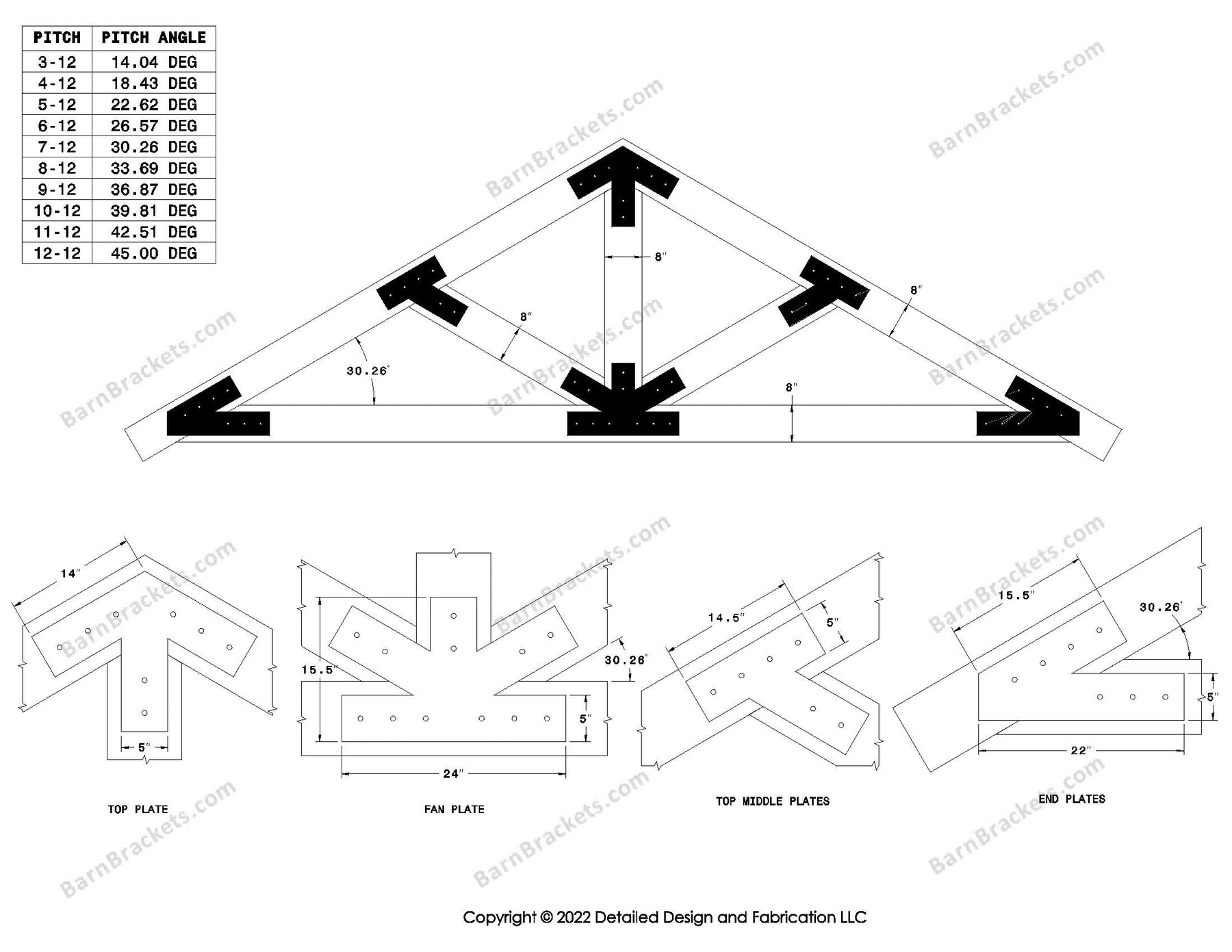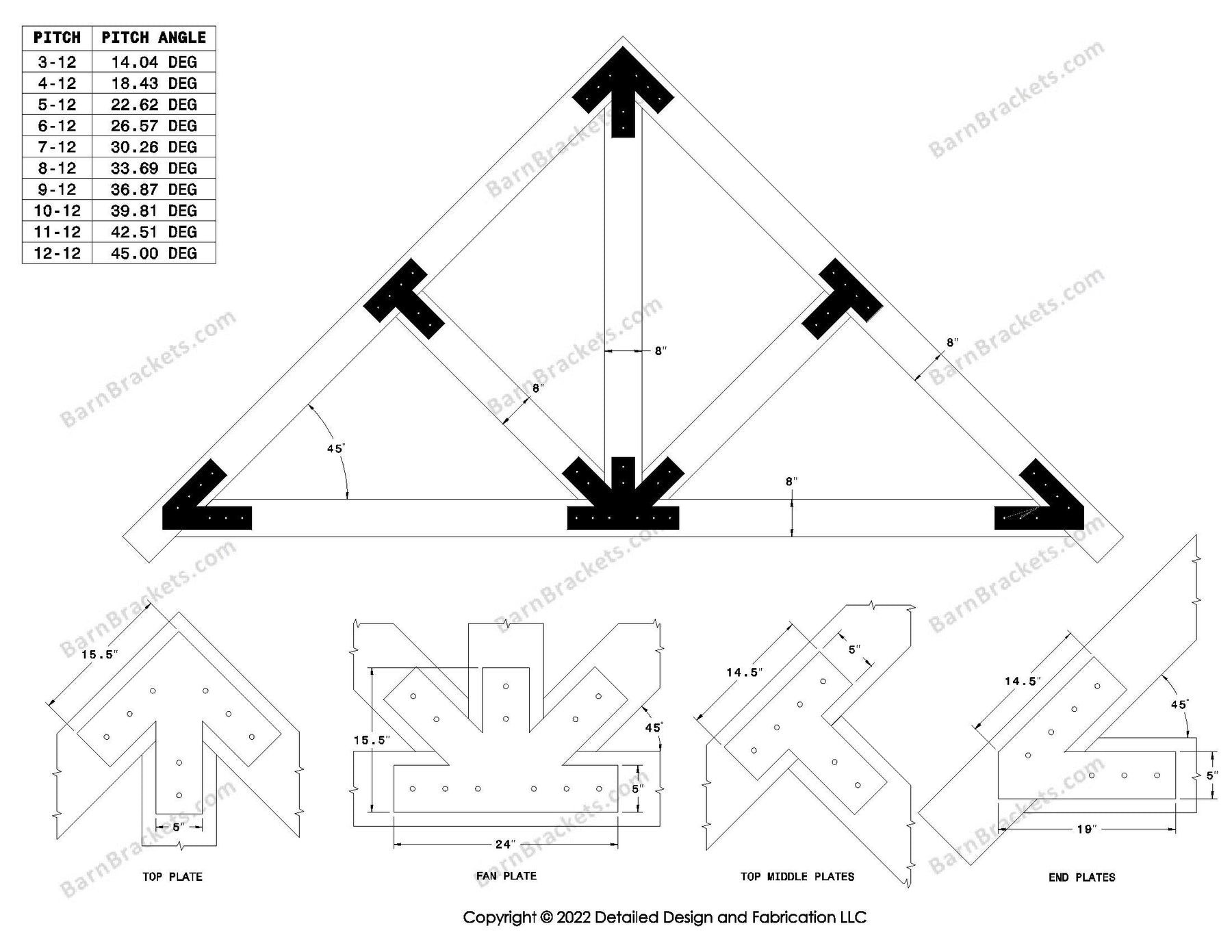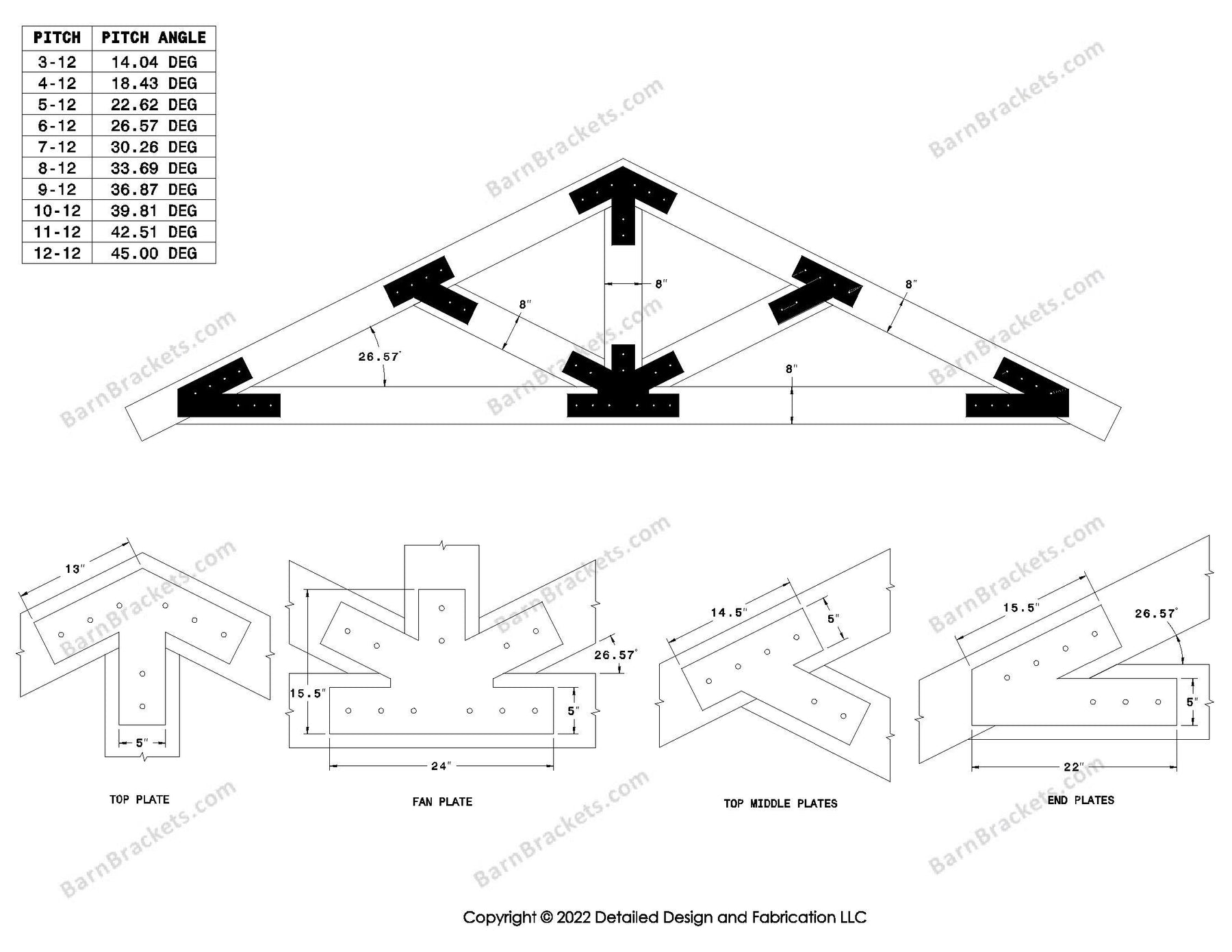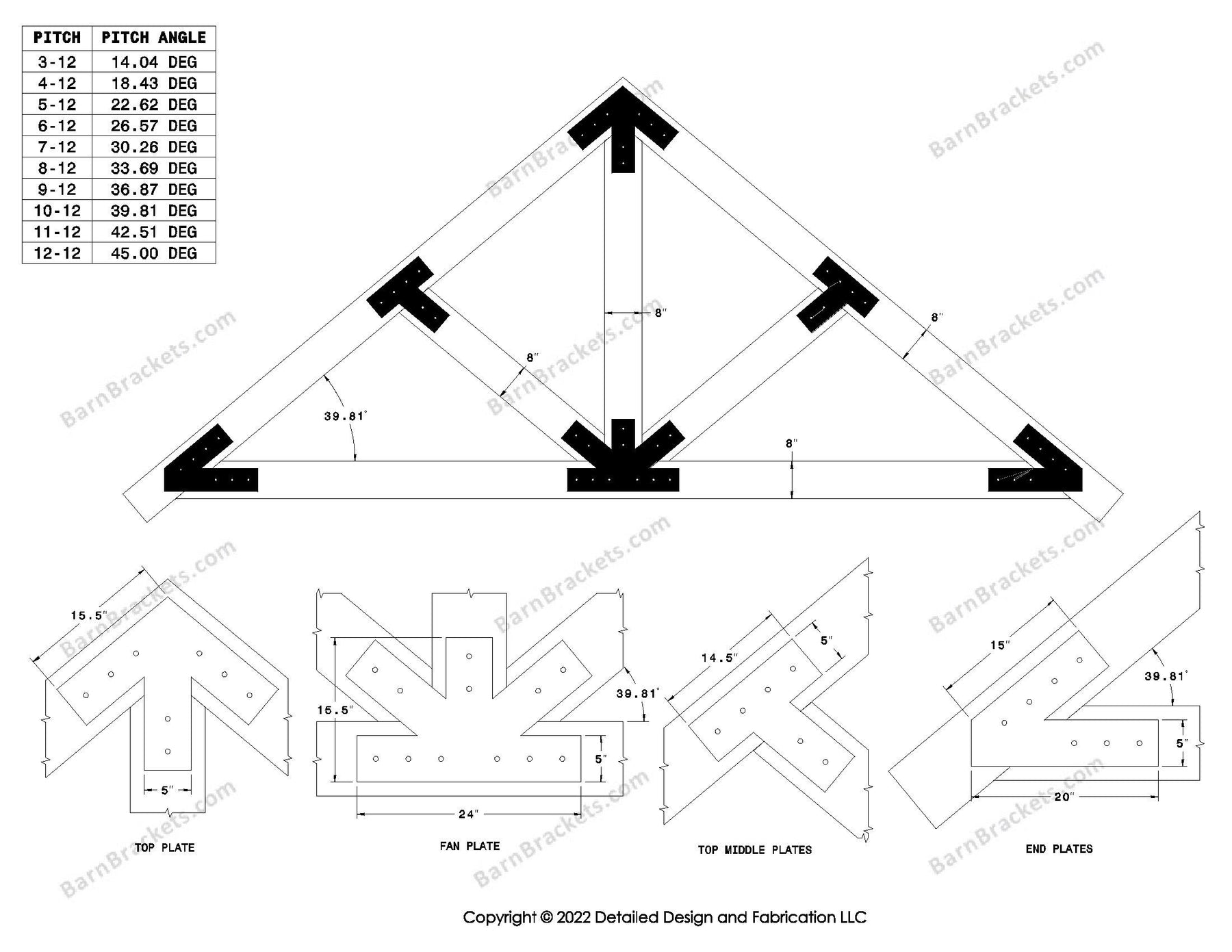 5 inch steel timber truss plate kit for 8 inch timber beams.  King post truss with diagonal chords.  Designed with overhang ends and square corners.  Dimensions are for a 3-12 pitch roof.