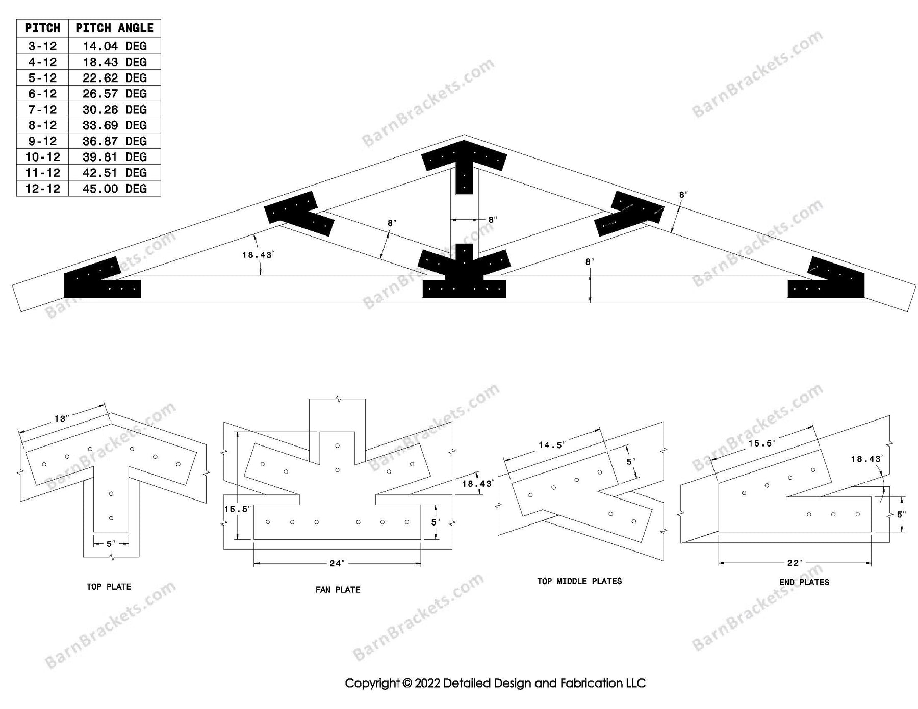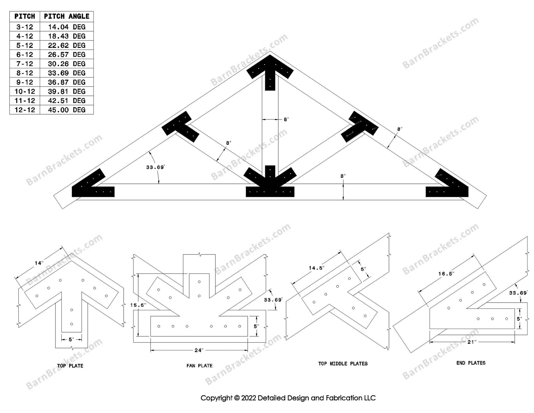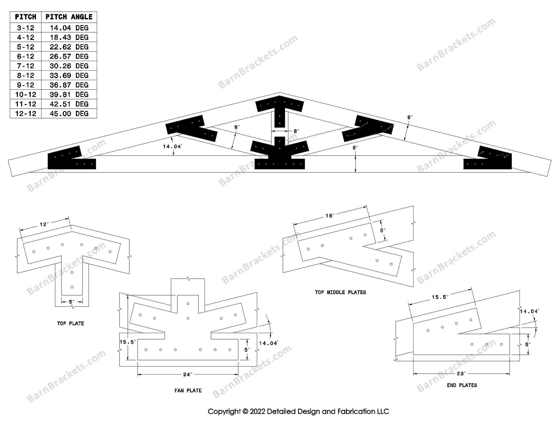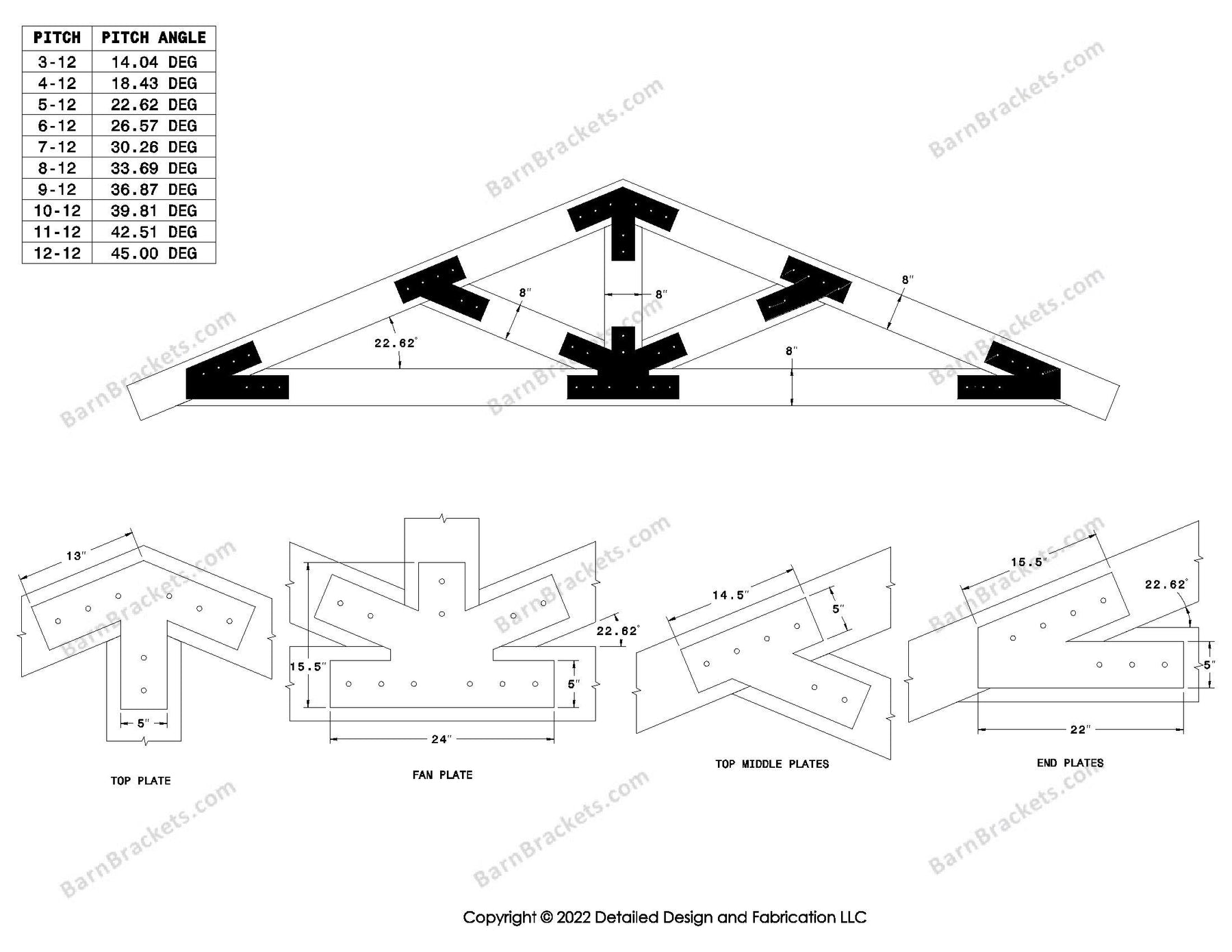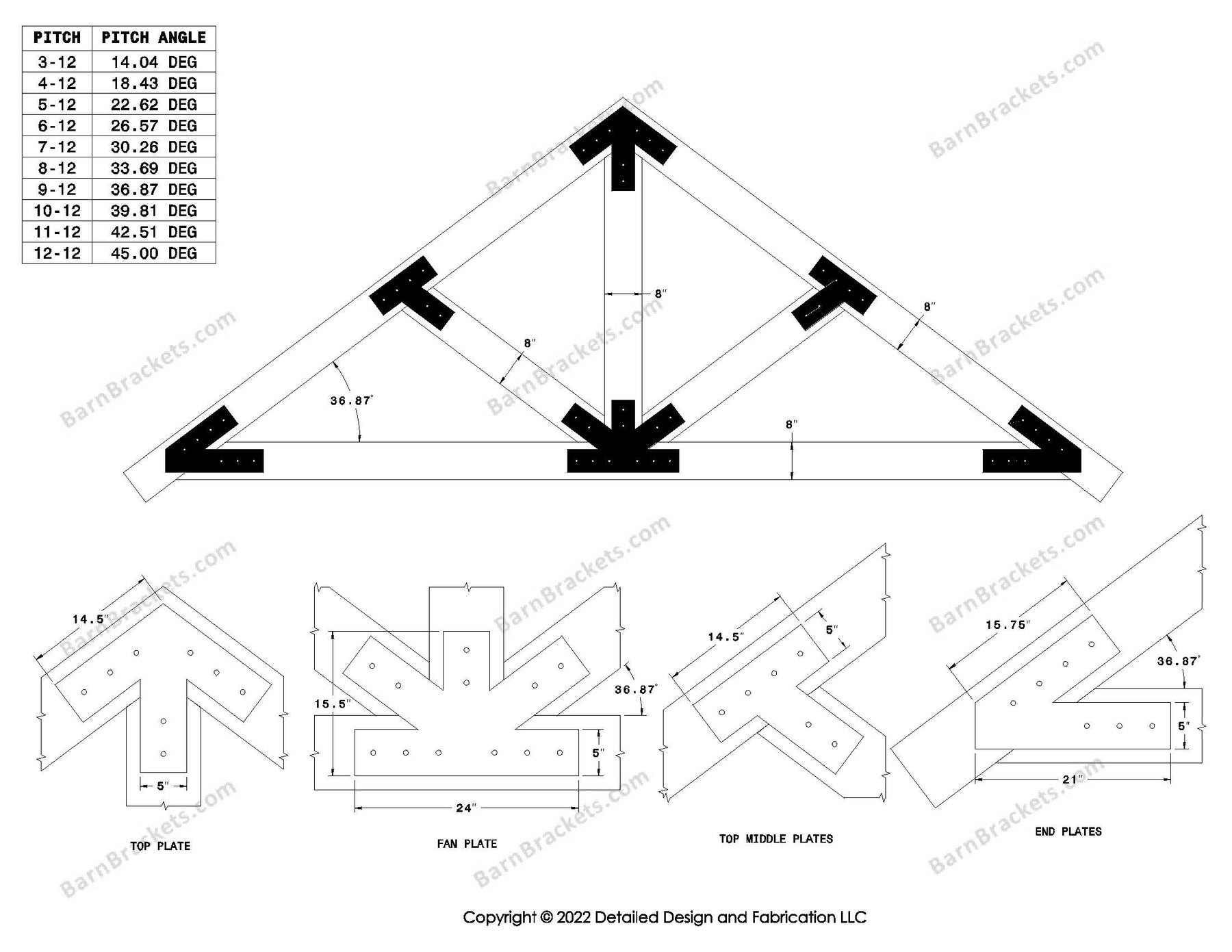 5 inch steel timber truss plate kit for 8 inch timber beams.  King post truss with diagonal chords.  Designed with overhang ends and square corners.  Dimensions are for a 3-12 pitch roof.